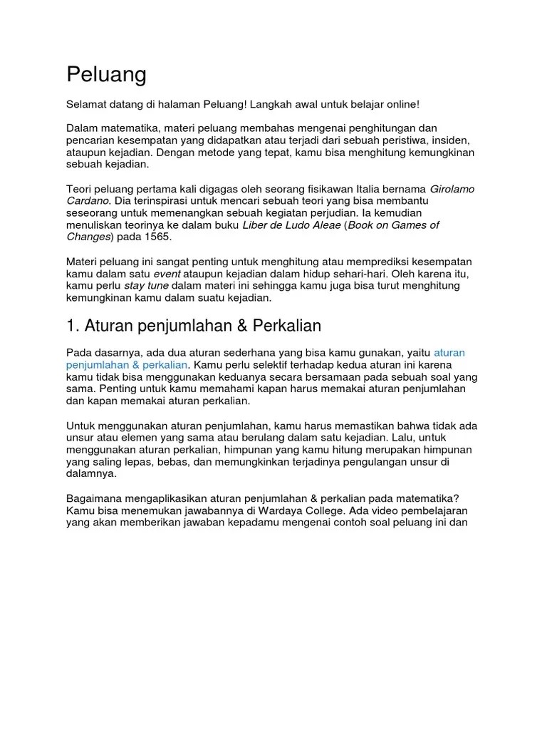 Contoh soal peluang kejadian saling lepas. Merupakan peluang kejadian saling lepas: Rumus peluang saling bebas bisa kamu liat di bawah ini. Kejadian saling lepas a b = kejadian a dan b tidak dapat terjadi secara bersamasama. Jika sebuah dadu dan sekeping mata uang dilempar undi . Pa b pa pb 4 52 12 52 16 52 4 13. Untuk artikel kali ini kita akan membahas peluang kejadian majemuk yaitu peluang kejadian saling lepas dan saling bebas. Seperti itulah cara menjawab soal peluang kejadian tidak saling lepas. Sebuah kartu bisa menjadi warna hitam, kartu as maupun keduanya. Kejadian saling komplemen ' jika . Ruang sampel dan kejadian peluang suatu kejadian . P(3 dan 5) = p(3) x p(5) = 1/6 x 1/6 = 1 / 36 9. Perlu kamu ketahui, percobaan yang tadi kamu lakukan sebenarnya adalah salah satu contoh dari dua kejadian yang .